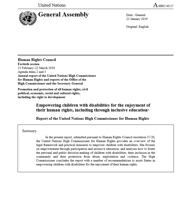 En este informe, presentado de conformidad con la resolución 37/20 del Consejo de Derechos Humanos, la Alta Comisionada de las Naciones Unidas para los Derechos Humanos ofrece un panorama general del marco jurídico y las medidas prácticas para empoderar a los niños y niñas con discapacidad.